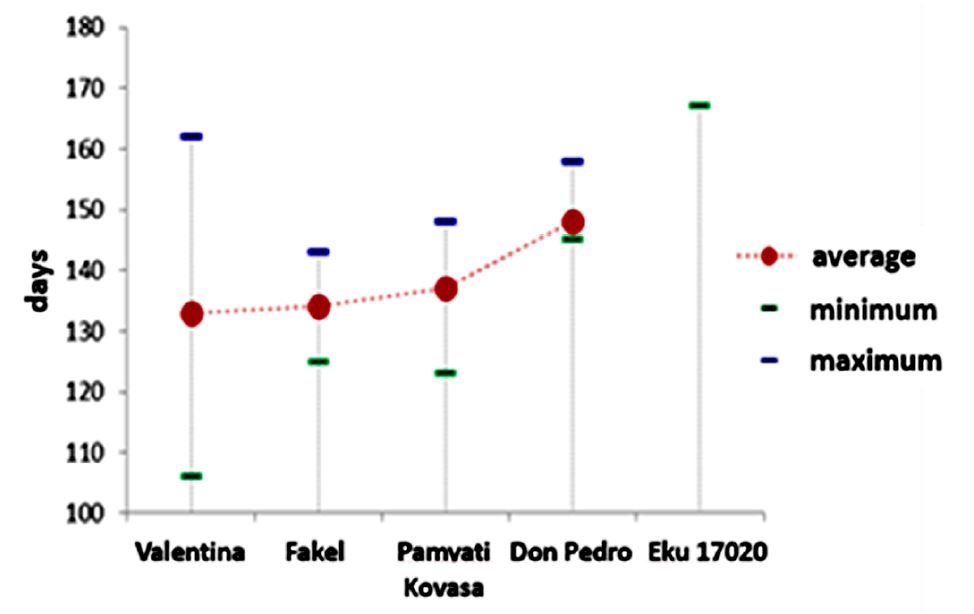 Fig. 1. Variation of growing season in amaranth varieties grown in open fields of the Moscow region (2013—2016)