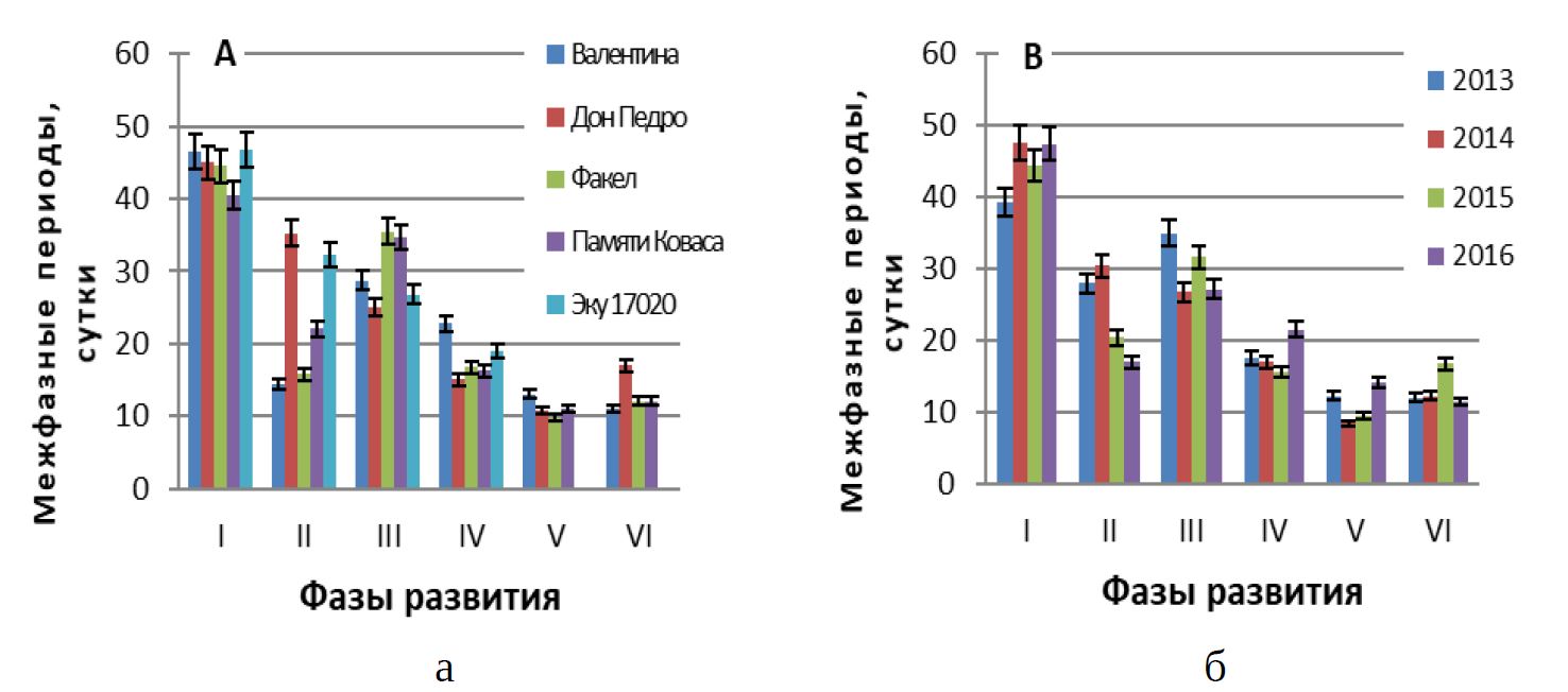 Fig. 2. Variation of growth periods in amaranth plants depending on the variety (a) and the year of growth (b) in different growth stages