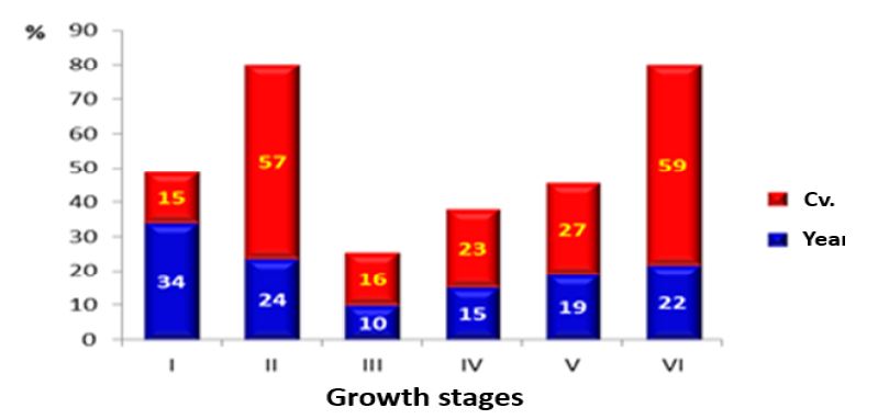 Fig. 3. The proportion of the influence of genotype (cultivar) and climatic factors (year)