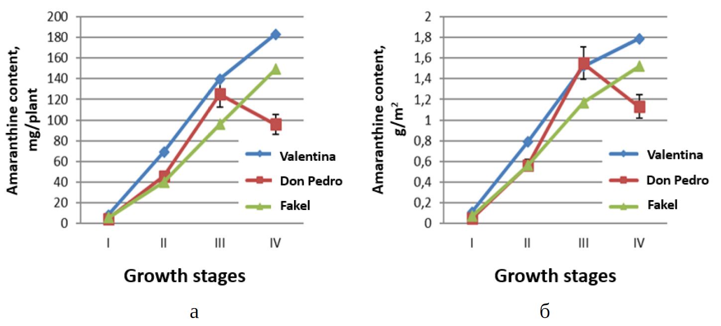 The article focuses on phenological features of amaranth varieties grown in open fields as a reaction to variability of weather conditions in the Moscow region. Amaranthine is one of the promising compounds found in red-colored amaranths. It refers to a class of betalain pigments. The study revealed growth stages defined by the highest content of amarantine per plant and analyzed accumulation of the pigment in amaranth leaves and inflorescences. Phenological observations of introduced plant species under new conditions are important and determine their resistance to adverse environmental factors, ability to produce high quality fruits and seeds, and potential for cultivation. During the introduction of new amaranth varieties, the most adapted forms were selected for the conditions of the Non-Chernozem zone of the Russian Federation in 2013-2016. The studied Russian and Ecuador varieties were divided into 4 groups depending on the growth period (from germination to seed maturity). Analysis of phenological traits of plants confirmed that period of amaranth development did not depend on the variety, except the fourth stage of late-ripening cultivars - ‘Don Pedro’ and ‘Eku 17020’, dependent on weather conditions. Being dependent on weather conditions, the vegetative growth period turned to be the most stable. Late cv. ‘Eku 17020’ did not form mature seeds in open ground conditions, which is explained by its origin (Ecuador). In the present study we identified growth stages when plant raw materials had the highest dye content in red-leaved amaranth varieties (‘Valentina’, ‘Don Pedro’ and ‘Fakel’). We also considered the perspective of cultivation of green-leaved varieties with red inflorescences - ‘Pamyati Kovasa’ and ‘Eku-17020’ - as sources of biologically valuable compounds in the Moscow region.