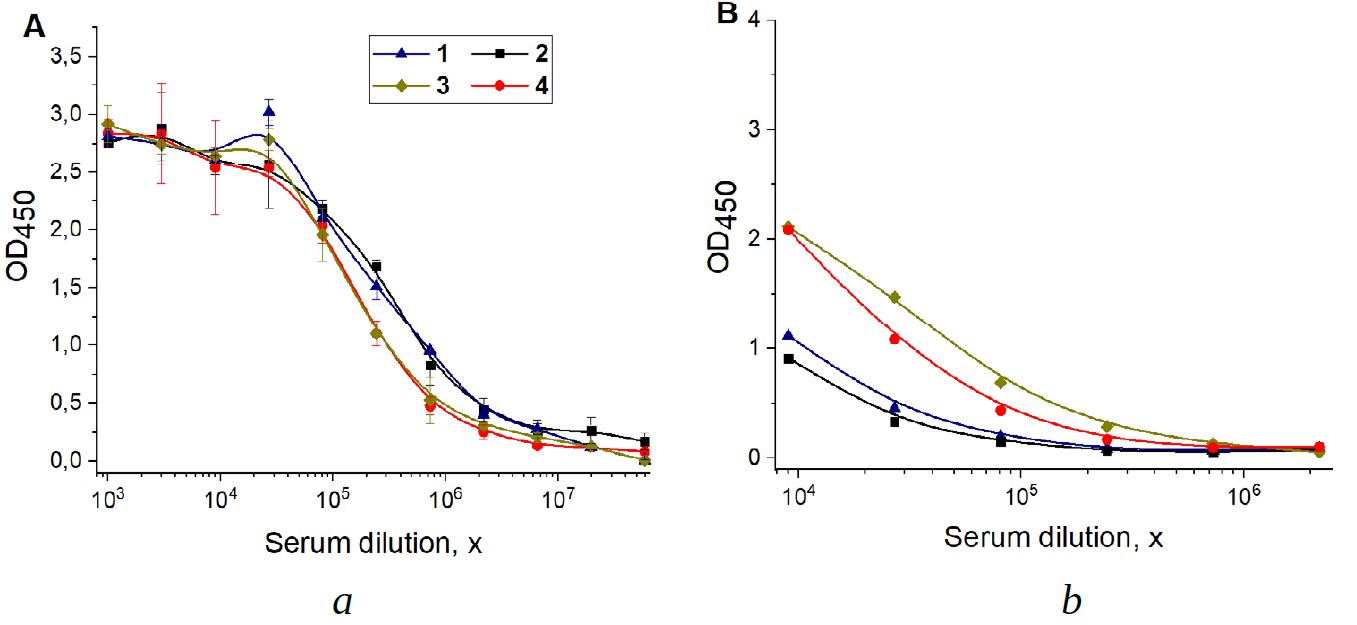 Fig. 1. Comparison of antisera specific to D. solani through ELISA, with absorption of D. solani bacteria (a) and P. atrosepticum (b) on a microplate: 1–4 — numbers of serum