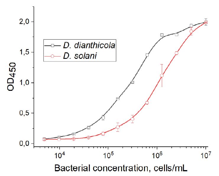 Fig 3. Concentration dependences obtained through ELISA from samples with different bacterial concentration of D. solani and D. dianthicola