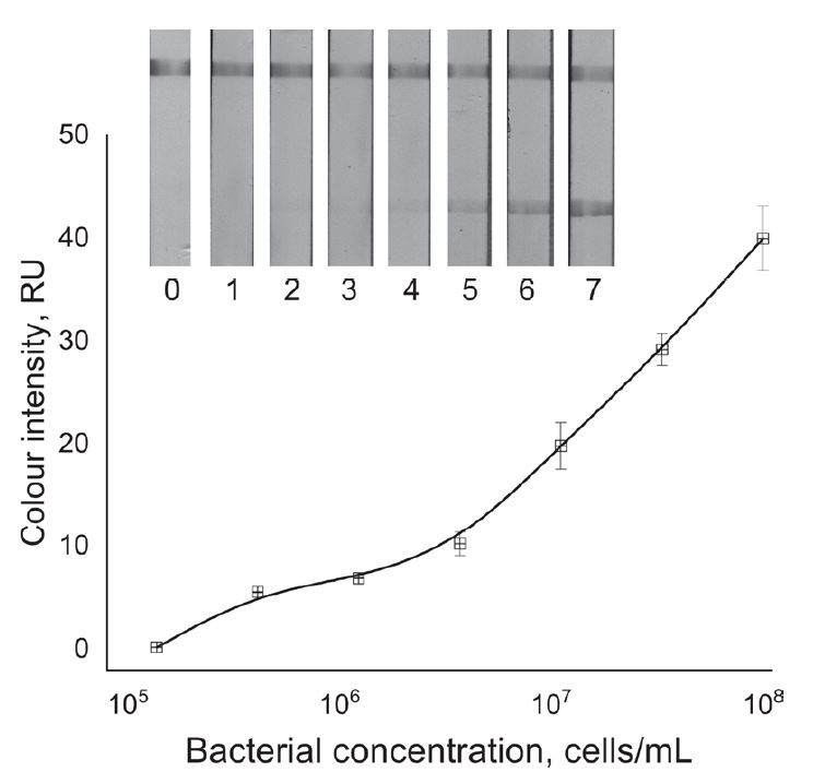 Fig. 4. Test strips after analysis of samples with different concentrations of D. solani: 0 — negative control; 1–1.4×105; 2–4.1×105; 3–1.2×106; 4–3.7×106; 5–1.1×107; 6–3.3×107; 7–1×108 cells/mL and the corresponding dependence of the color intensity of the test zones on the concentration of D. solani