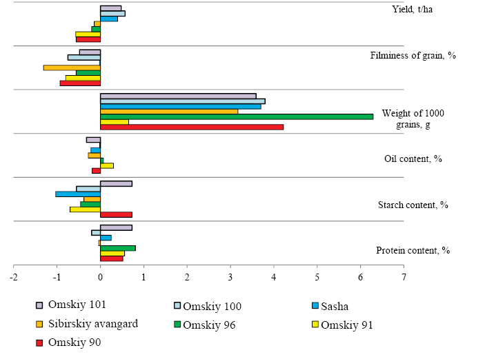 Cultivar | Mass fraction of protein,% | Mass fraction of starch,% | Mass fraction of crude fat, % | Weight of 1000 grains, g | Husk content,% | Yield, t/ha | ||||||