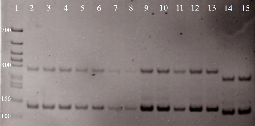 Fig. 2. Electropherogram of screening rice samples for the presence of blast resistance gene Pi-1 on a polyacrylamide gel: 1 — DNA marker 50+ bp DNA Ladder Evrogen (50—700 bp); 2 — C104-LAC (positive control); 3 — D7787/1; 4 — D7787/2; 5 — D7787/3; 6 — D7787/4; 7 — D7787/5; 8 — D7787/6; 9 — D7787/7; 10 — D7787 / 8; 11 — D7787/9; 12 — D7787/10; 13—1141/1; 14—1141/2; 15—1141/3