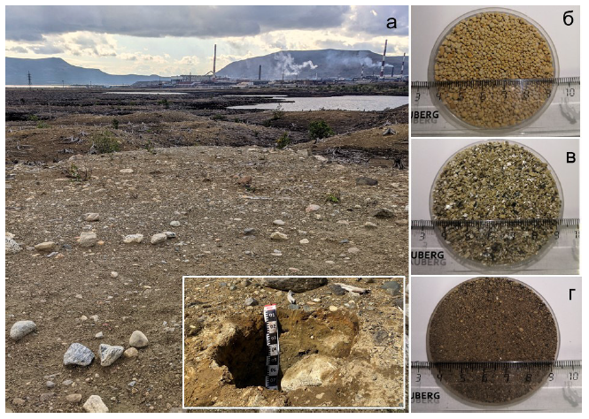 Fig. 1. Appearance of the research objects: а — general view; б — waste serpentine sorbent; в — expanded vermiculite (fr. 0.45…2.00 mm); г — podzol (fr. < 2.0 mm)