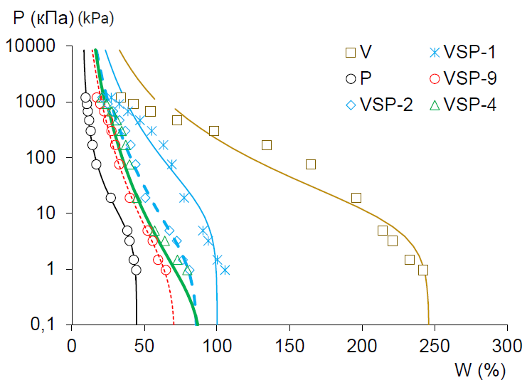 Fig. 6. Water retention curves of podzol P, expanded vermiculite V and soil mixtures based on them with the addition of waste serpentine sorbent VSP-1 1:3(1:1), VSP-2 1:3(1:2), VSP-4 1:4(1:1) VSP-9 1:5(1:4)