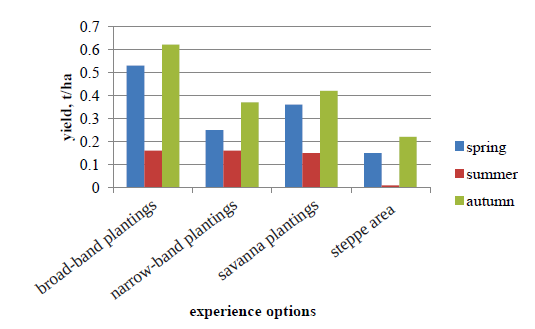 Forest pastures with different tree crown cover were studied. The seasonal dynamics of the yield and nutritional value of grass and twig-leaf fodder of forest pasture was studied. The unsystematic use of pastures in arid territories has increased the process of degradation and has become one of the factors of depletion of their natural vegetation. The use of forest reclamation in the 70s and 90s on sandy lands and pastures in the Western Caspian region made it possible to create significant areas of forest pasture land with strip and massive stands of Ulmus pumila L. and Robinia pseudoacacia L. Different types of tree stands created on pastures not only improve the microclimate and form a comfortable environment for grazing animals, but also are an additional source of valuable twig feed. The aim of the research was to study forage productivity of forest pastures with different types of plantings on the sands of the Western Caspian region. The objects of the research were forest pastures with different species composition and tree crown cover. Studies on the forage productivity of forest-reclaimed pastures were conducted in 2018-2020 on the basis of the North Caucasus branch of Federal Scientific Centre of Agroecology, Complex Melioration and Protective Af-forestation of the Russian Academy of Sciences. The research was based on field experiments and laboratory analyses. According to the results of the study, forest-reclaimed pastures with unsystematic grazing had 1.5…2-fold increase in productivity compared to natural ones. The largest amount of twig-leaf feed was formed in broad-band Robinia stands in summer-autumn period. The total gross stock of natural pastures of the Western Caspian region did not exceed 0.3…0.4 t/ha of dry weight, the consumed stock was 0.2…0.3 t/ha. With the help of strip and massive plantings on degraded pasture lands, it is possible to increase significantly their productivity and quality with the achievement of 7 MJ of exchange energy and 0.26…0.29 feed units in 1 kg of elm and robinia twig-leaf feed during droughts.