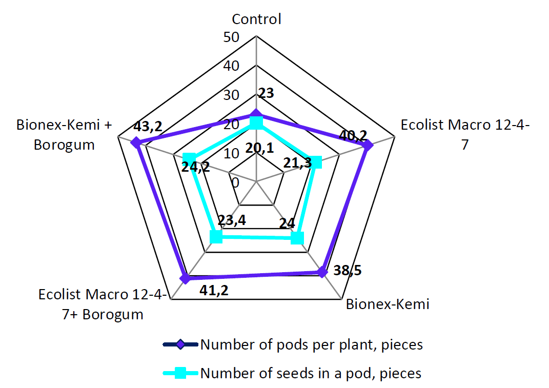 Бионекс-Кеми — на 0,94, Бионекс-Кеми + Борогум — на 1,29, Эколист Макро 12– 4–7 + Борогум на 3,42 % по сравнению с контролем (НСР05 0,8 %).