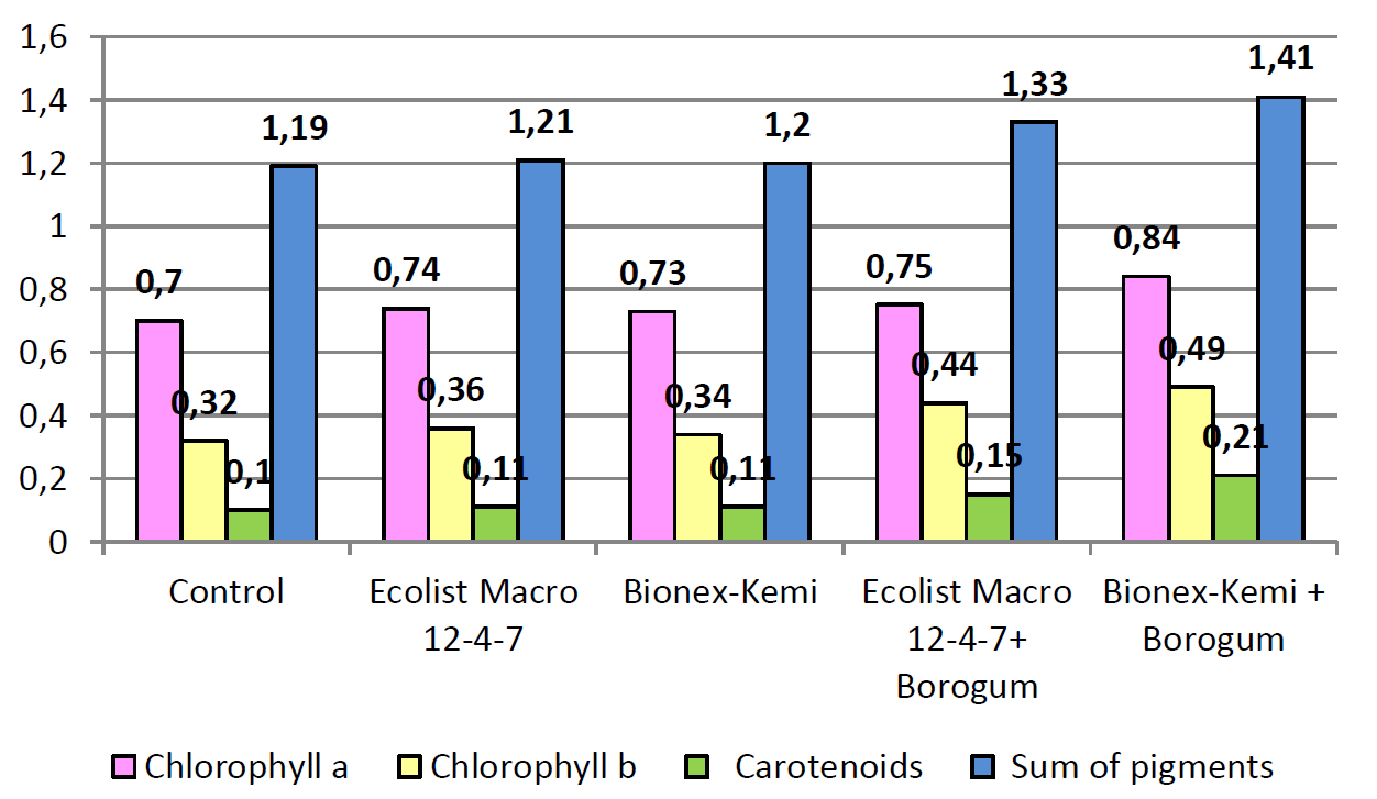 Общая сумма пигментов на контрольном варианте составила 1,19 мг/г, на Эколист Макро 12–4–7–1,21, на Бионекс-Кеми — 1 ,20, на Бионекс-Кеми + Борогум — 1,33 и на Эколист Макро 12–4–7+ Борогум — 1,41 мг/г.