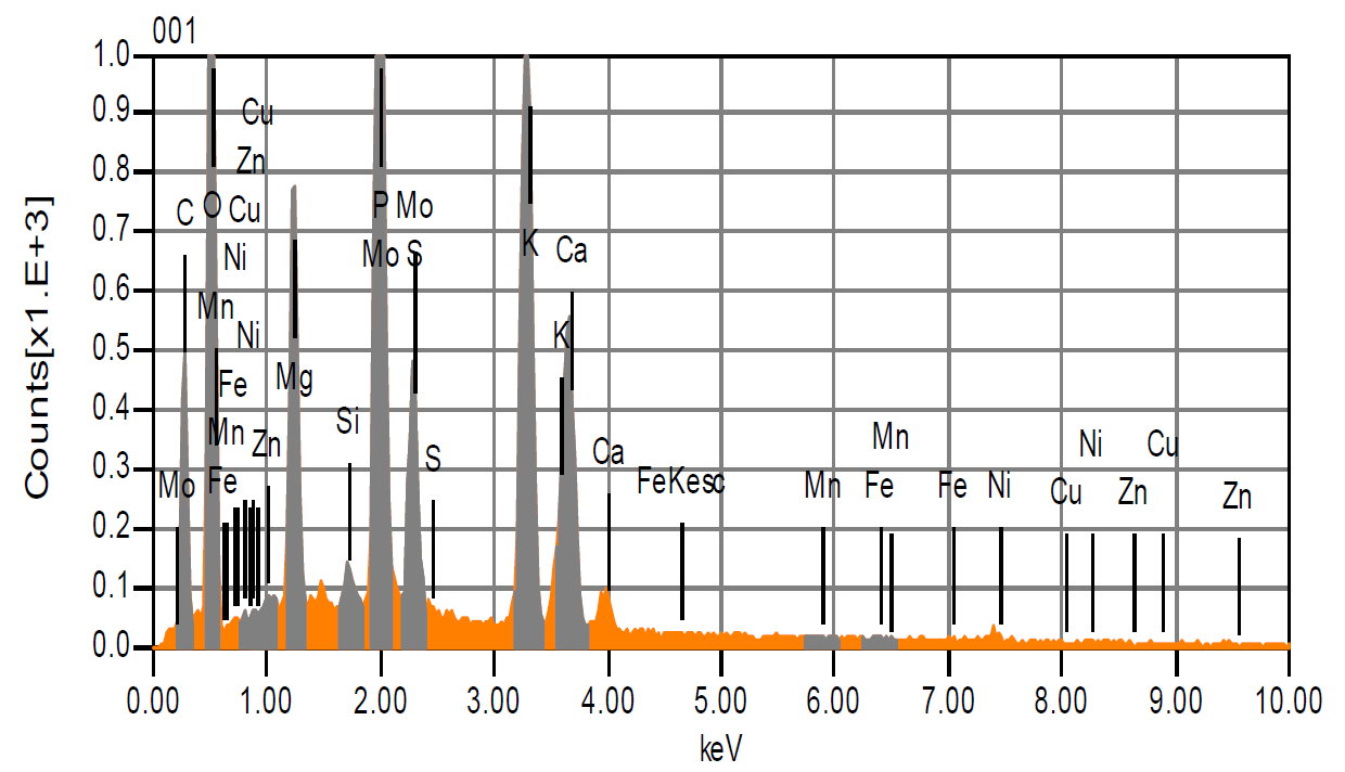 В результате проведенного анализа химического состава основных компонентов золы (P, S, K, Mn, Fe, Mg, Ca, Zn, Mo) семян ярового рапса, установлено, что элементный состав семян практически не имел различий по вариантам исследования. Убывающий ряд содержания элементов в золе имел следующий вид: P ≈ K > Mg ≥ Ca> Mo> S > Zn > Mn > F (рис. 6).