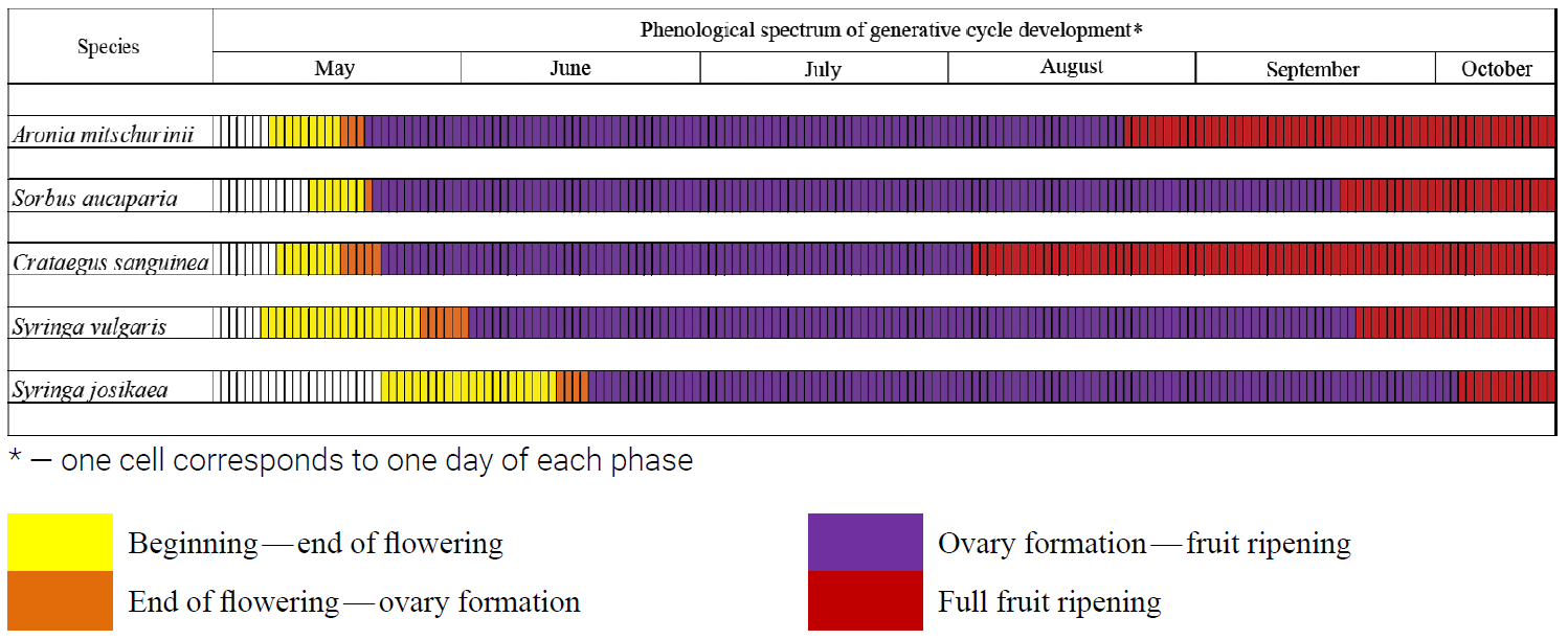 Наименьшая продолжительность цветения по данным среднемноголетних наблюдений отмечена у Sorbus aucuparia и Crataegus sanguinea — по 7 и 8 дней соответственно. Продолжительность периода от окончания цветения до образования завязи у видов достаточно короткий и составляет от 1 (у Sorbus aucuparia) до 6 дней (у Syringa josikaea).
