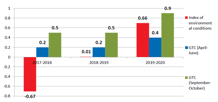 Fig. 1. Dynamics of hydrothermal coefficient (GTC) and index of environmental conditions in research years (according to the Chernoyarsk weather station)