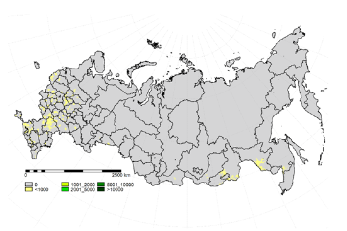 A vector map of ploughed soils in Russia was also used [18]. The geometric part of the map represents the mapping units of the vector soil map of Russia (vector map, created using original paper soil map of Russia at scale 1:2,5 mln. It is available in a form of geotiff (pixel size is 300 m) file or as a shape file) [19], to which the information about the type of prevailing and three associated soils in each soil-geographical unit is attached. Also in the attribute part of this database is the percentage of plowing of each of these soils is indicated. There are a total of 25711 map units, with attributive information attached to each unit.