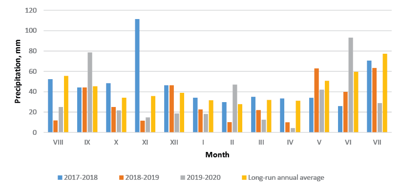 Сезон 2019—2020 гг. характеризовался недостаточным атмосферным увлажнением. Количество атмосферных осадков было существенно ниже среднемноголетних значений. Озимая пшеница была посеяна в ранние сроки, что позволило минимизировать негативное влияние засухи в начальный период роста и развития растений. Зима была засушливее и теплее, а весна — з асушливее и холоднее по сравнению с климатической нормой. Это было серьезным лимитирующим фактором в формировании урожая озимой пшеницы.