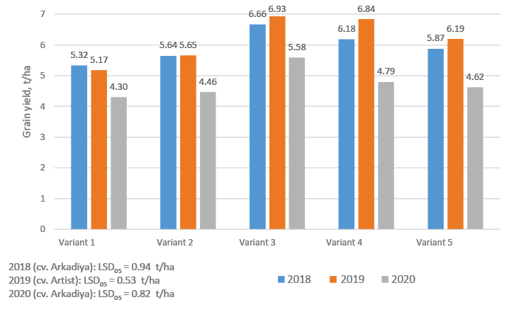 Рис. 3. Урожайность зерна озимой пшеницы (стандартная влажность — 12 %)