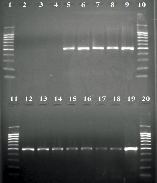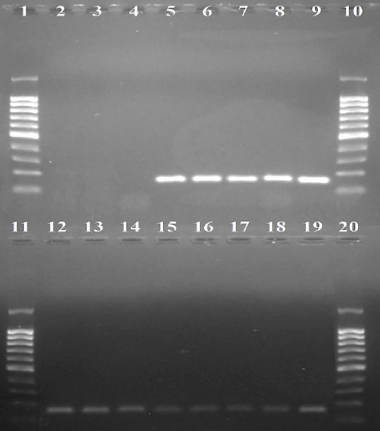 Fig. 2. Electropherogram of PCR testing of samples infected with strain 0337 for the presence of Xanthomonas translucens with primers 4F1/4R 1: 1, 10, 11 and 20—100 bp DNA length marker; 2, 3 — Negative control sample (Extract); 4 — Pure Phosphate buffered saline (PBS); 5, 8 — PBS infected with strain 0337 at concentrations of 1.5×106—1.5×103 respectively; 9, 12 — strain 0337 in extract (1.5×106); 13, 14 — strain 0337 in extract (1.5×105); 15, 16 — strain 0337 in extract (1.5×104); 17, 18 — strain 0337 in extract (1.5×105); 19 — Positive control sample