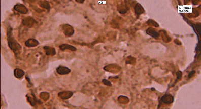 Fig. 1. Structure of renal glomerulus in the left kidney of female soprano pipistrelle (colony no. 1). Coloring according to the method of V.I. Turilova et al. (1998), ×1200