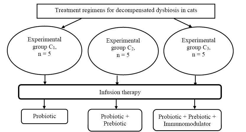 Cats with decompensated intestinal dysbacteriosis admitted to veterinary clinics by ‘envelope method’ were randomly divided into three experimental groups: C1 (n = 5); C2 (n = 5) and C3 (n = 5). The study design is shown in the figure.