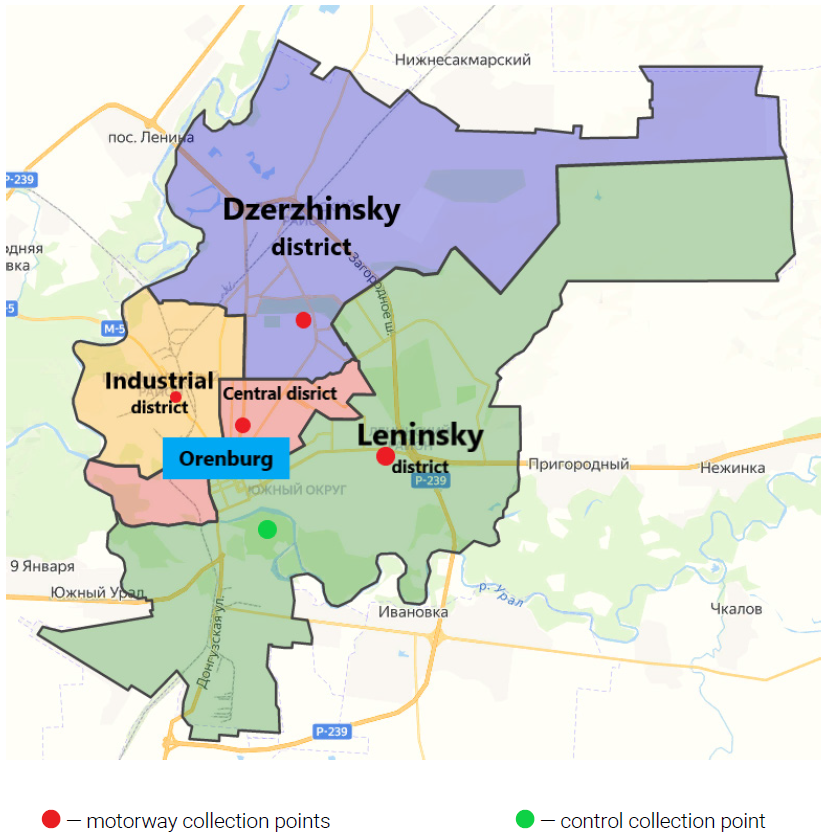 Fig. 1. Map of the administrative districts of Orenburg indicating sampling points