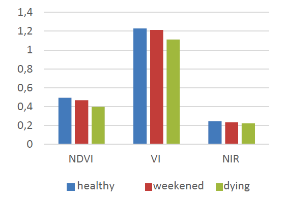 When carrying out forestry, constant monitoring of plant condition and growth is very important. There is a wide range of Earth remote sensing sources for effective management of woody vegetation in vast areas. The purpose of the study was to identify areas with weekened and dying tree crops in the green observation zone of Astana, Kazakhstan, covering ‘Batys’ forestry using remote sensing data. The results of studies carried out for research on the growth and development of artificial plantations were obtained. During the experiment, a comparison of remote sensing data was performed using an unmanned aerial vehicle Supercam S350F with multispectral camera Micasense RedEdge and high-resolution measurements obtained with Sentinel‑2 and PlanetScope satellites in order to select a method for solving the tasks. Based on the materials of multispectral diagnostics, the state of forest plantations in ‘Batys’ forestry was revealed, where 35 % of tree crops were classified as healthy, 30 % — as weakened, and 35 % — as dying.