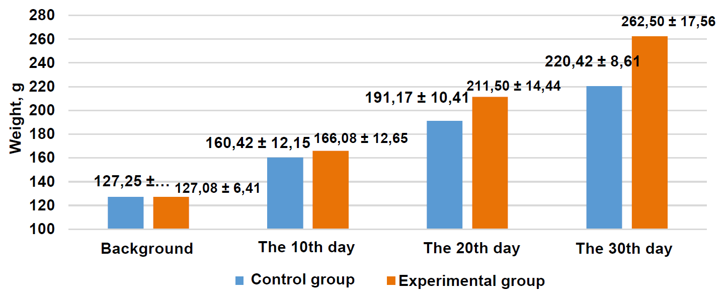 Fig. 5. Comparative analysis of live weight indicators of chinchillas from experimental and control groups