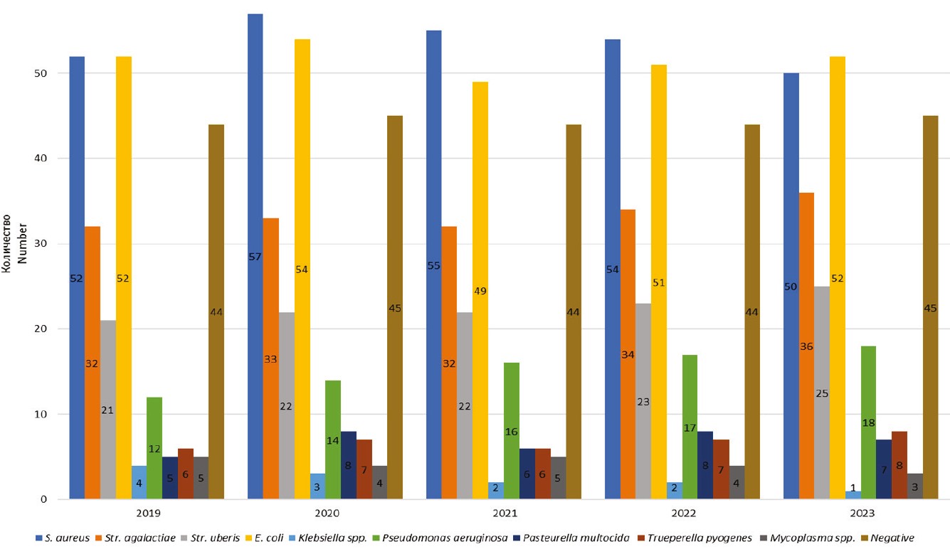 Из условно патогенных микроорганизмов свою долю заняли Pseudomonas aeruginosa 77 (6,38 %), Pasteurella multocida 34 (2,82 %), Trueperella pyogenes 34 (2,82 %) и Klebsiella spp. 12 (1 %). Представители рода микоплазм Mycoplasma spp. были зарегистрированы в 21 случае (1,74 %). Все эти возбудители встречались в форме моноинфекций — 22 % и смешанных инфекций — 78 %. Особенно это было характерно для стрептококков Str. agalactiae и Str. uberis. Однако, П.А. Руденко, А.А. Руденко, Ю.А. Ватников отмечают наличие микробных ассоциаций среди возбудителей мастита у коров от 2 до 7 возбудителей [17]. Количественное распределение устойчивых изолятов за пятилетний период показано на рис. 2. Необходимо отметить, что количество выделенных проб E. coli уменьшилось с 57 в 2020 г. до 50 в 2023 г., т. е. на 12,28 %, S. aureus с 54 в 2020 г. до 51 в 2022 г. соответственно на 5,88 %. Аналогичное снижение количества положительных результатов отмечается и у Klebsiella spp. с 4 в 2019 г. и до 1 в 2023 г., хотя тенденция более выражена и достигает 400 %. У Mycoplasma spp. эти показатели отмечаются на уровне 5 в 2019 и 2021 гг., снижаясь до 3 в 2023 г., соответственно на 60 %. Было бы справедливо отметить, что на этих возбудителей оказывают воздействие как факторы внешней среды (характер содержания, особенности соблюдения гигиены, практика доения, особенности профилактических мероприятий и т. д.), так и состояние внутренней среды организма коров (защитные факторы иммунитета, гормональный фон и т. д.). Это отмечается как российскими исследованиями [7, 10], так и зарубежными [8, 9].