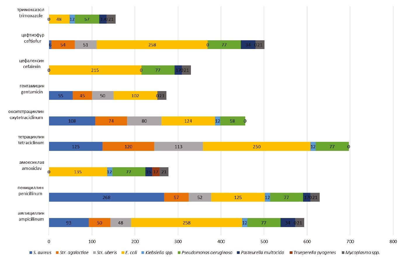 При проведении исследований устойчивости к противомикробным препаратам было выявлено 100 % устойчивости E. coli к препаратам ампициллин и цефтиофур, Pseudomonas aeruginosa — к ампициллину, пенициллину, амоксиклаву, цефалексину и цефтиофуру, Pasteurella multocida — ампициллину и цефтиофуру, Mycoplasma spp. — ампициллину, пенициллину, амоксиклаву, гентамицину, цефалексину, цефтиофуру и тримоксазолу, Str. uberis к тетрациклину и S. aureus к пенициллину. Устойчивость к противомикробным препаратам более чем у 40 % штаммов установлено у S. aureus к тетрациклину (46,64 %) и окситетрациклину (40,3 %), Str. agalactiae к тетрациклину (71,86 %) и окситетрациклину (40,31 %), Str. uberis к окситетрациклину (70,8 %), ампициллину (42,48 %), пенициллину (46,02 %), цефтиофуру (45,13 %) и гентамицину (44,25 %). E. coli показала высокую устойчивость к тетрациклину (96,9 %), цефалексину (83,33 %), пенициллину (48,45 %), окситетрациклину (48,06 %) и гентамицину (39,53 %), Pseudomonas aeruginosa (74,03 %) к тримоксазолу, Pasteurella multocida к пенициллину и тримоксазолу (по 50 %) и амоксиклаву (47,6 %), Trueperella pyogenes (50 %) к амоксиклаву. Кроме того, наблюдалась умеренная устойчивость S. aureus к ампициллину (34,7 %), гентамицину (20,52 %), цефтиофуру (2,24 %), Str. agalactiae к пенициллину (34,13 %), цефтиофуру (32,34 %), ампициллину (29,94 %), гентамицину (26,95 %), E. coli к гентамицину (39,53 %) и тримоксазолу (18,6 %).