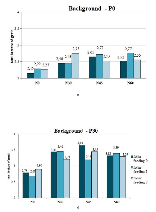 Fig. 1. The effect of fertilization on yield of spring wheat depending on the phosphorus background: a — Background P0; б — Background P30 (LSD05 А — 0.23; В — 0.33; С — Ff < Ft; АВС — 0.80)