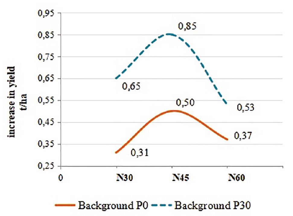 The effectiveness of fractional application of nitrogen fertilizers in cultivation of spring common wheat was studied in the conditions of the Omsk Irtysh region on meadow-chernozem medium-sized medium-humus heavy loamy soil. The research object was spring common wheat (Triticum aestivum L.) cv. ‘Melodiya’. The purpose of the research was to establish the effectiveness of fractional application of nitrogen fertilizers depending on the level of labile phosphorus in meadow-chernozem soil on yield and grain quality of spring common wheat in the conditions of the Omsk Irtysh region. The field experiment had three factors (2×4×2): Factor A — phosphorus background: 1. No fertilizers; 2. Application of P30 a. i./ha; factor B — main application of ammonium nitrate in increasing doses: 0, N30, N45, N60; factor C — foliar feeding with ammonium nitrate and carbamide at a dose of N30: 1. Once in heading stage; 2. Twice in heading stage and milky ripeness. It was found that the most effective was main application of nitrogen-p hosphorus fertilizers in doses of N30–45P30; crop productivity in these variants increases by 40…48 % in comparison with the nonfertilized variants due to the gain in 1000-seed weight (r = 0.40…0.42), productive stooling (r = 0.83). The agronomic profitableness of one kg of a. i./ha applied fertilizers in these variants was 21.5 and 19.9 kg of grain with 7.5 and 6.1 kg increase in protein content, respectively. Late foliar sprayings, regardless of their number, did not increase crop productivity and quality of wheat grain. Thus, fractional application of nitrogen fertilizers in years with insufficient moisture levels (hydrothermal index 0.6–0.7) is not effective.