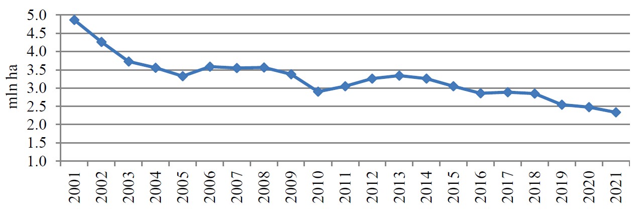 Fig. 1. Oat cultivation area in Russia, million hectares, 2001–2021