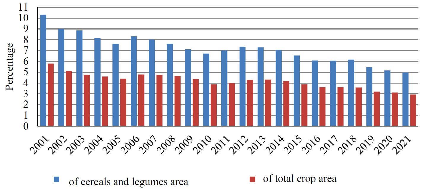 Fig. 2. Share of oat cultivation area in Russia, %, 2001–2021