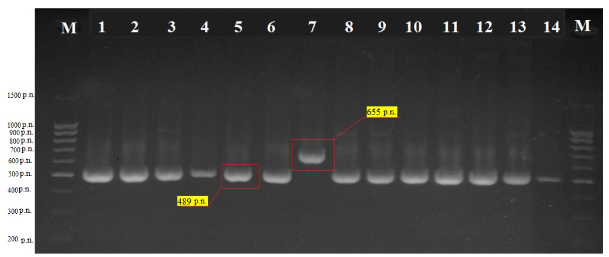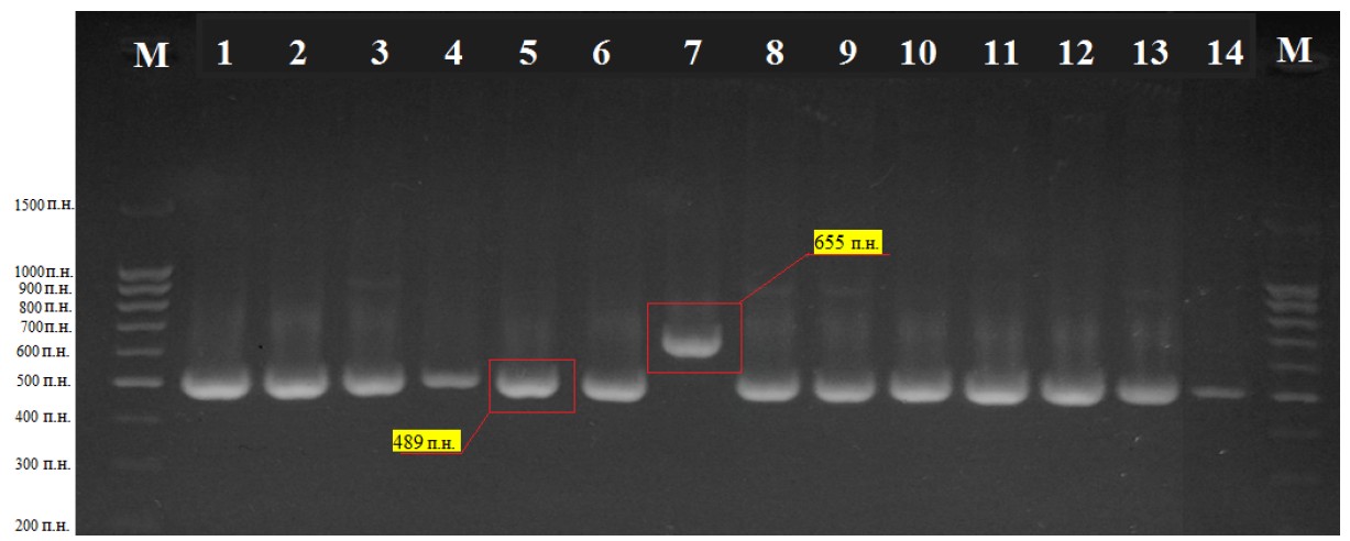 Results of PCR identification of alleles of the Md ACS1 gene of the apple tree. Breeding forms of apple trees, selected according to agronomic traits: M — molecular weight marker; 1 — from hybrid family Carmen × Gemini; 2–9 — from hybrid family Champion × Modi; 10 — from hybrid family Honeycrisp × Fujion; 11–12 — from hybrid family Liberty × Renuartsiv; 13–14 — from hybrid family Elite 12/1–21–63 × Modi