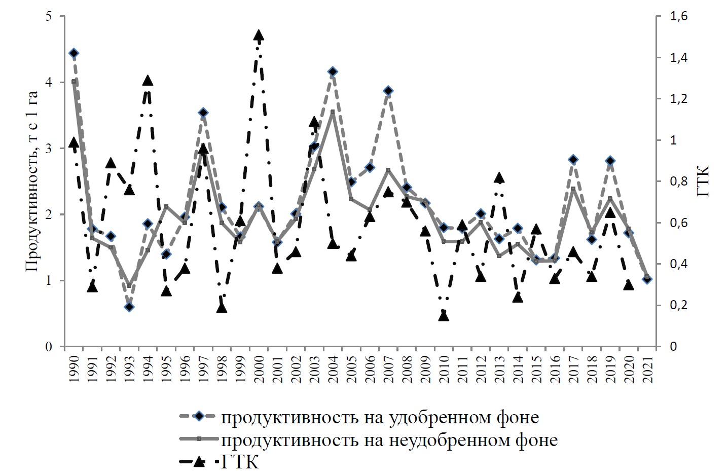 Годы эксперимента включают все многообразие погодных условий от влажных до очень засушливых лет с низким ГТК периода вегетации.
