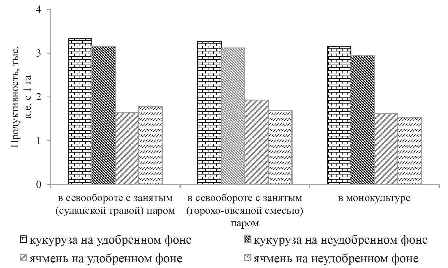 В севообороте с занятым (суданской травой) паром продуктивность ячменя на неудобренном фоне выше, чем по удобренному фону (рис. 2).