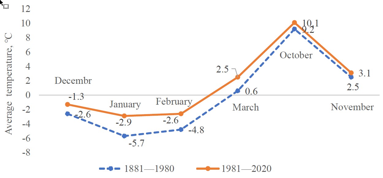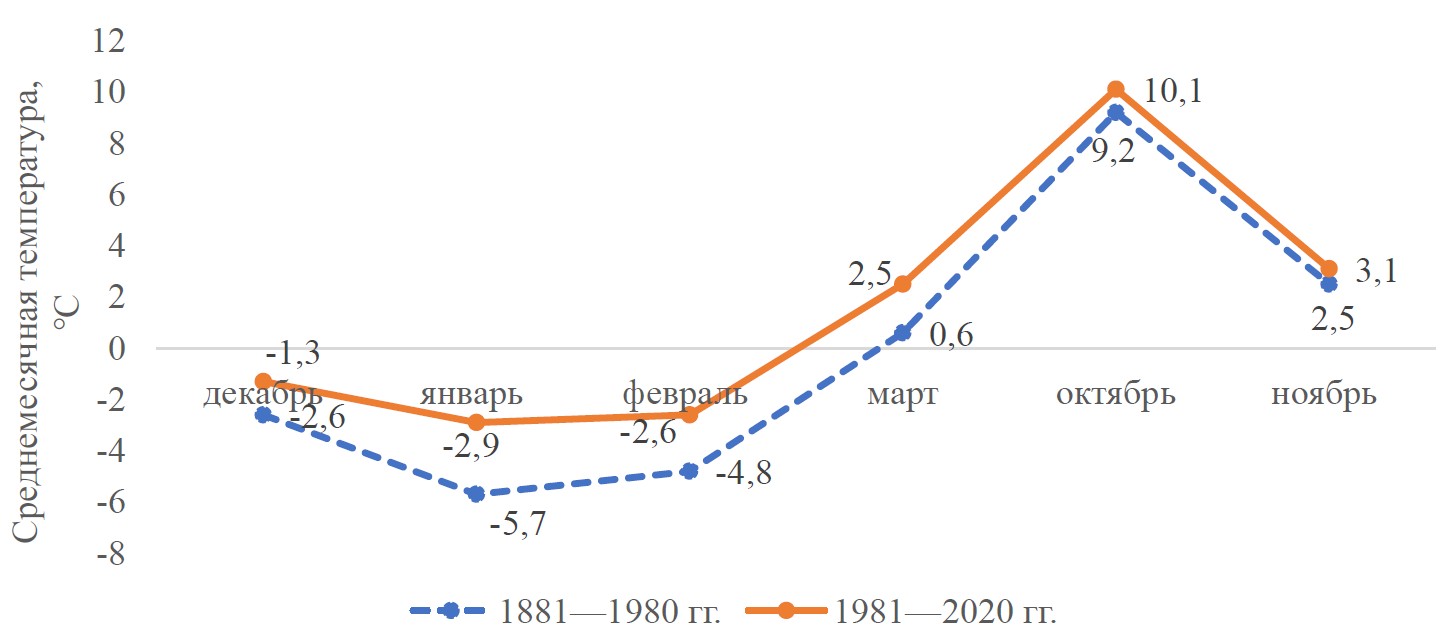 Сравнительный анализ данных табл. 1 и 2 выявил, что показатели холодного периода 1981–2020 гг. намного выше, чем аналогичные показатели 1881–1980 гг. Наибольшее расхождение замечено в средней температуре, так в 40-летнем периоде его величина составила 1,5 °C, а за 100-летний — всего лишь –0,1 °C. Отмечено повышение температуры в декабре — феврале с –4,4 до –2,3 °C, т. е. в 2 раза, что очень существенно, как известно, температура воздуха холодного периода оказывает значительное влияние на образование талого стока. В то же время отмечено увеличение количества осадков за 100-летний период: в целом за октябрь — март и декабрь — февраль до 169 и 134 мм соответственно.
