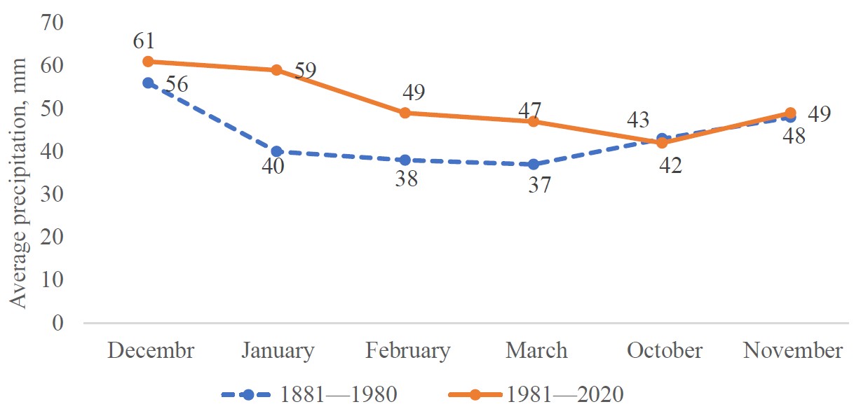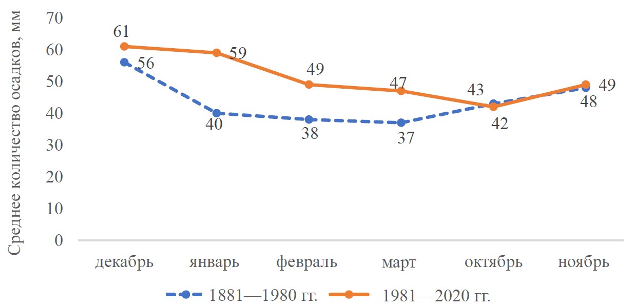 Рис. 2. Среднемесячное количество осадков за холодный период года
