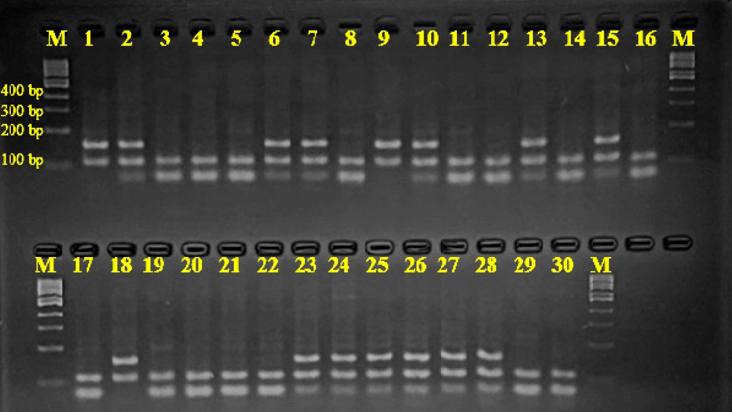 Визуализация результатов ПЦР-ПДРФ гена LGB: М — ДНК-маркер; 1, 9, 18 — генотип АА; 2, 6, 7, 10, 13, 15, 23–28 — генотип АВ; 3–5, 8, 11, 12, 14, 16, 17, 19–22, 29, 30 — генотип ВВ