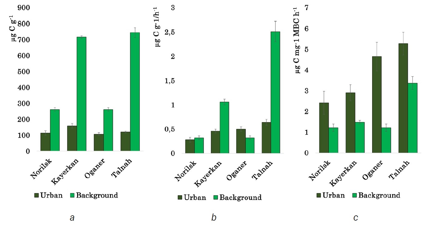 Arctic cities are an important and relevant object of research due to the unique combination of extreme natural and climatic conditions and anthropogenic impact. Microbial communities are sensitive indicators of changes occurring as a result of anthropogenic impact, including urbanization, the consequences of which in the Arctic zone are poorly studied and poorly predictable. The aim of this study was to assess the microbiological potential of urban soils of the Norilsk agglomeration (Norilsk, Kayerkan, Oganer and Talnakh) to perform ecological functions based on the study of some microbiological parameters. The number of saprotrophic and oligotrophic bacteria, microscopic fungi (plating method), microbial biomass and respiration (substrate induced respiration method), functional diversity of microbial communities (MicroRespTM technique), and the sanitary and hygienic state of soils were studied. It was revealed that urban soils were characterized by low microbial biomass (from 107 to 159 μg C g–1) compared to the background, but sufficient microbial respiration (from 0.28 to 0.64 μg C g–1h–1), which indicates their high activity. An increase in the number of culturable bacteria and microscopic fungi was noted in urban soils and, in some areas, an increase in the functional diversity of microbial communities compared to the background. Microorganisms capable of decomposing easily accessible compounds — carbohydrates and carboxylic acids — prevailed in the community, but the proportion of microorganisms utilizing difficult-to-decompose compounds was also high (up to 20%). The sanitary and hygienic condition of urban soils of the agglomeration was assessed as moderately hazardous. An increase in the number of coliform bacteria, enterobacteria and opportunistic microfungi has been noted, which is generally characteristic of urban ecosystems and is not critical. The identified patterns suggest that urban green infrastructure can form niches for the microorganisms that can effectively perform ecological functions despite stressful conditions. In this case, issues of an integrated environmental approach to solving the problems of landscaping and improvement of Arctic cities, selecting a range of plants and technologies for the care and maintenance of green infrastructure are becoming increasingly relevant, which will contribute to the formation of sustainable and healthy urban ecosystems.