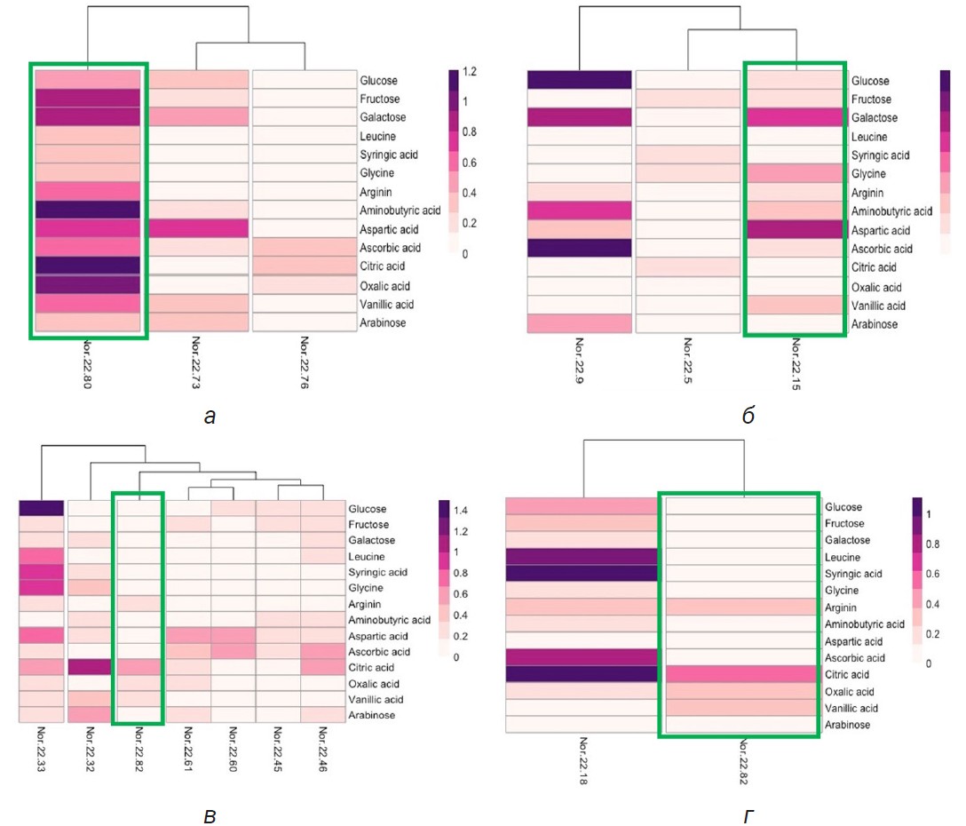 Fig. 3. Heat map of the functional diversity of soil microbial communities in the soils of the Norilsk agglomeration in comparison with the background ones: а — Kayerkan; б — Talnakh; в — Norilsk; г — Oganer. The green line is the background area
