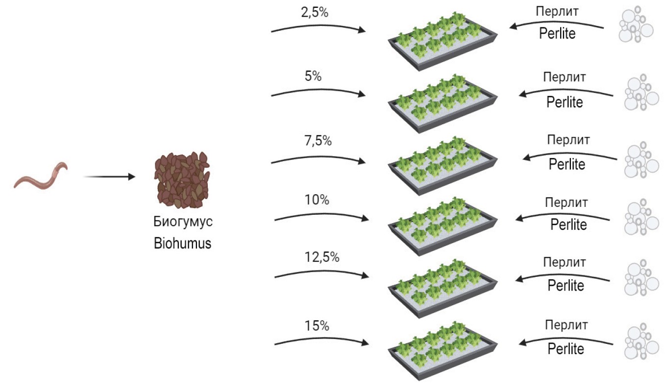 Fig. 2. Experimental scheme for the effect of light soils based on perlite with addition of biohumus on growth and physiological parameters of Lactuca sativa L.