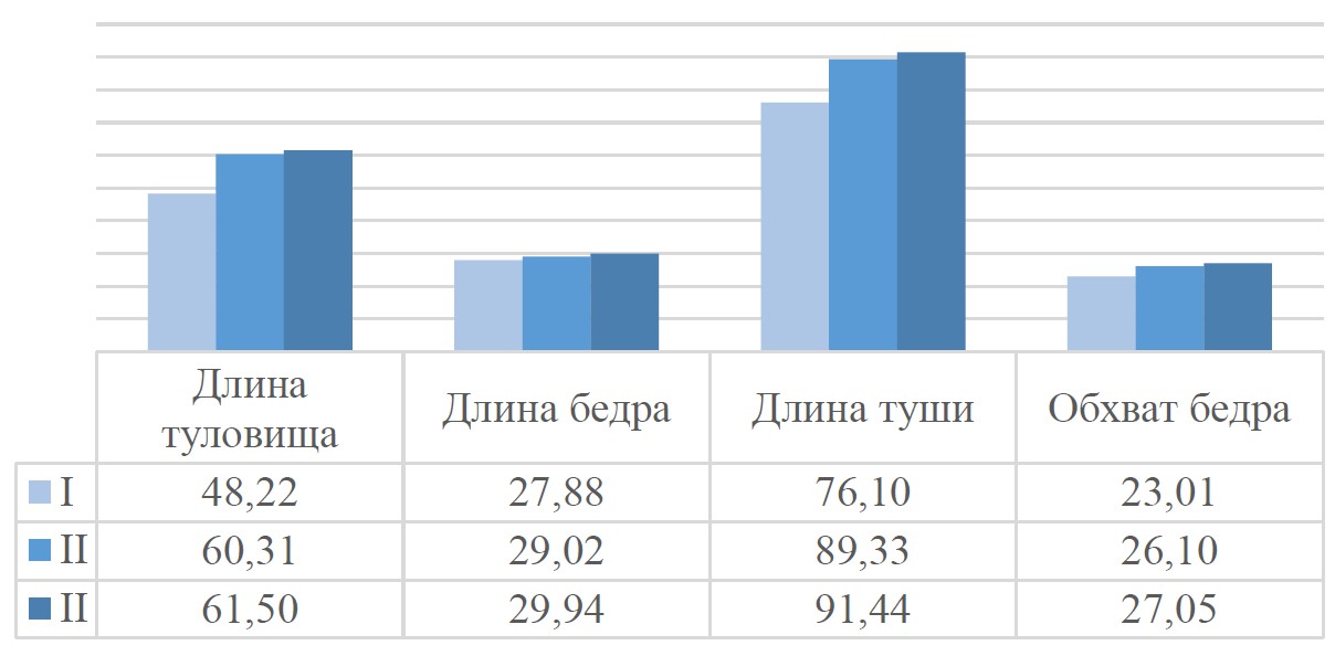 It is characteristic that the leading position in all morphometric parameters of the carcass was occupied by the second-generation crossbreds of group III. They surpassed the first-generation crossbreds of group II in body length by 1.19 cm (1.97%), thigh length by 0.92 cm (3.17%), carcass length by 2.11 cm (2.36%), and thigh girth by 0.95 cm (3.64%) (Fig.).