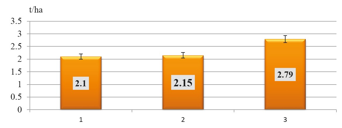 Biological yield of soybean cv. Nevesta in 2021–2023, t/ha: 1 — control; 2 — herbicides (treatment of vegetative plants); 3 — herbicides + bioproduct (treatment of vegetative plants)