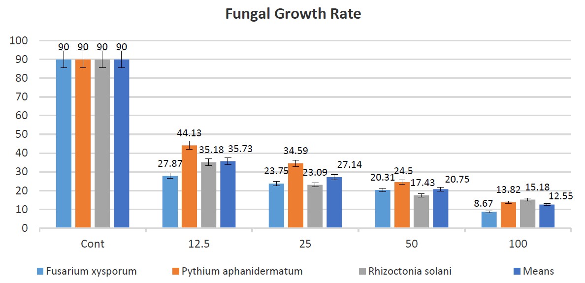 This study investigates that the aqueous extract of propolis at four concentrations (12.5, 25, 50, and 100%) effectively inhibits the growth of pathogenic fungi Fusarium oxysporum, Pythium aphanidermatum, and Rhizoctonia solani. The highest inhibition rate was observed at the highest concentration (100%), where Rhizoctonia solani. exhibited the lowest growth rate (83.14%) and the highest inhibition rate (85.77%) for Pythium aphanidermatum. The presence of bioactive compounds such as Diethyl Phthalate, docosane, Alkanox 240, and Tricosane identified through GC-MS analysis underpins the antifungal properties of the extract. These compounds contribute to the antifungal activity, suggesting that propolis extract could be a viable bio-fungicide. Given its efficacy, low cost, and environmental friendliness, propolis extract presents a promising alternative to commercial chemical fungicides. Its application could reduce chemical fungicides’ environmental and health impacts, supporting sustainable agricultural practices and enhancing crop protection naturally.