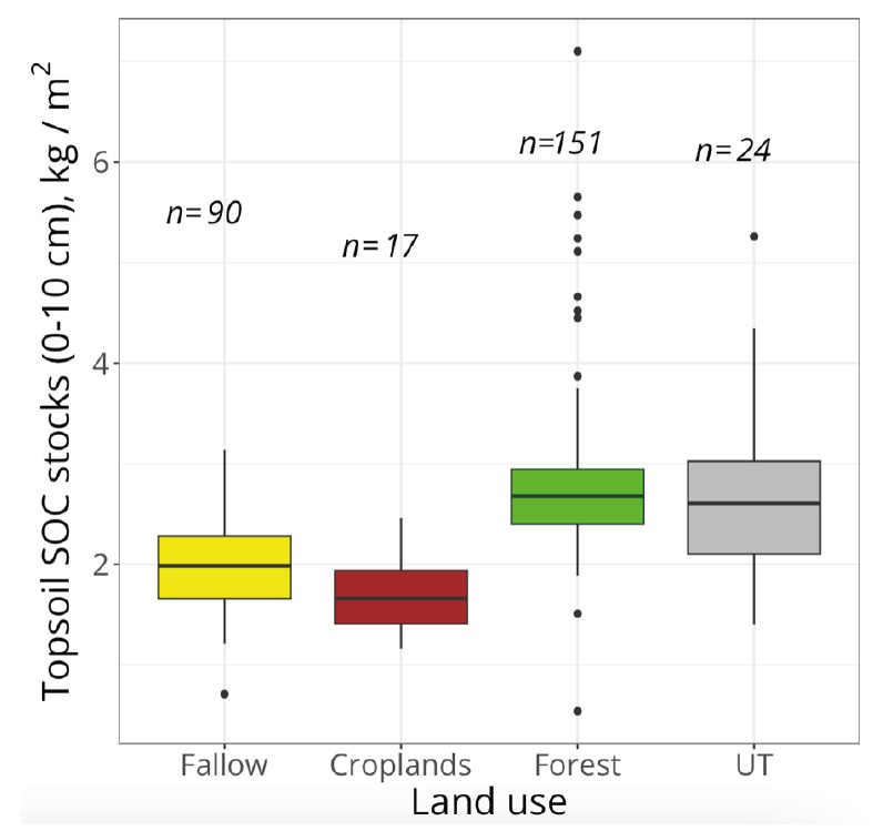 Fig. 1. Distribution of topsoil SOC stocks of different land use types according to legacy soil survey data: UT — urbanized territories