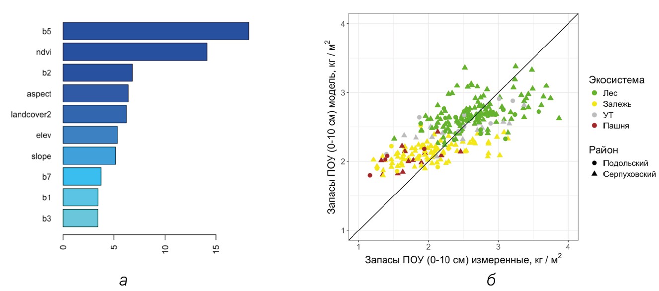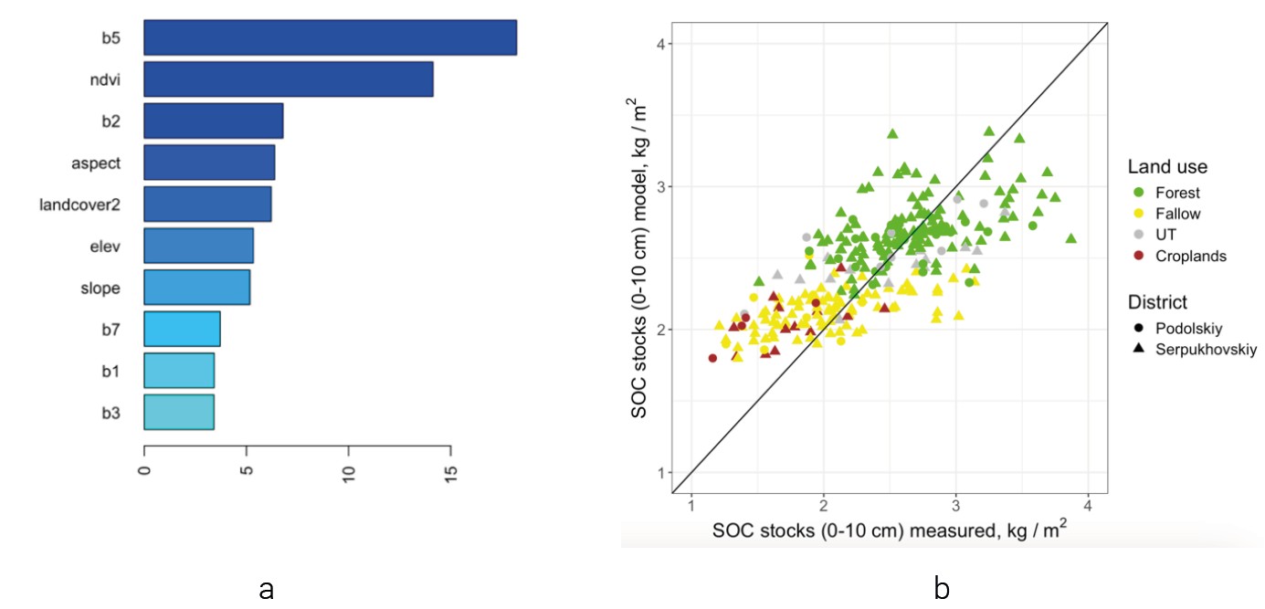 Fig. 2. Relative importance of predictors, %, explaining the variability of SOC in the upper 10cm layer (a), and comparison of measured and predicted SOC stocks values (0—10 cm) in two districts of the Moscow region (b). UT — urbanized territories