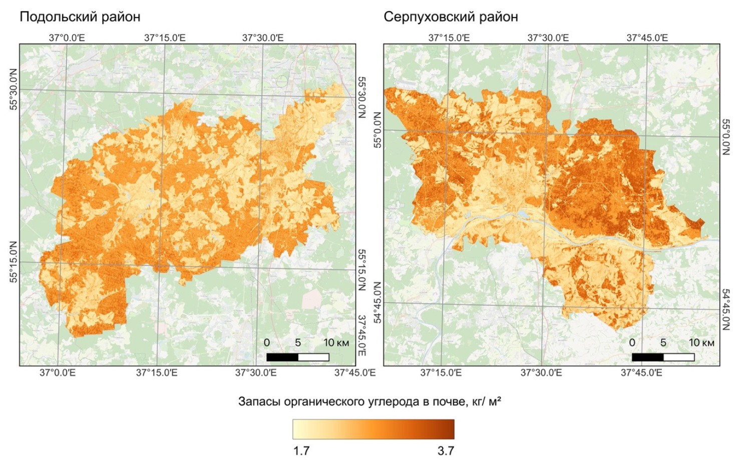 Fig. 3. Spatial distribution of SOC stocks in the topsoil (0—10 cm) for Podolskiy and Serpukhovskiy districts of Moscow region (predicted values as of 2007)