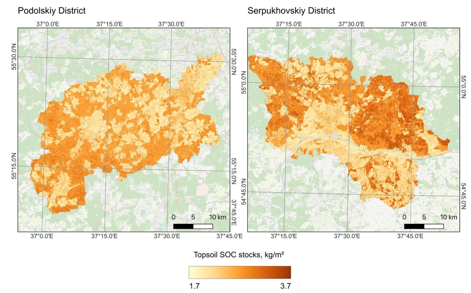 This study presents the result of topsoil (0—10 cm) soil organic carbon (SOC) mapping in two areas of Moscow Region (2007 status): 1096 km2 — Podolsky District, and 1101 km2 — Serpukhovsky District. Based on 2007 legacy soil sampling data (n = 282) within these areas, we have created a statistical model between the target variable (SOC stocks, kg/m2) and numerous covariates (legacy maps and remote sensing data). GBM model has explained 56% of soil organic carbon stocks variability. Differences in stocks within different land use types were shown quantitatively. At the same time, the spectral reflectance in the near infrared band (B5) of Landsat‑5 TM made the greatest contribution in explaining the differences within individual types (among fallow lands and urbanized areas), and the spectral index NDVI has explained the spatial variability of soil organic carbon among forest ecosystems. The root mean square error of cross-validation (RMSEcv = 0.67 kg/m2) was chosen to describe the uncertainty of soil organic carbon stock prediction. According to the model, the total soil organic carbon stocks in the upper 10 cm soil layer of the Podolsky District were 2.65 ± 0.72 Tg, for the Serpukhovsky District — 2.77 ± 0.73 Tg.