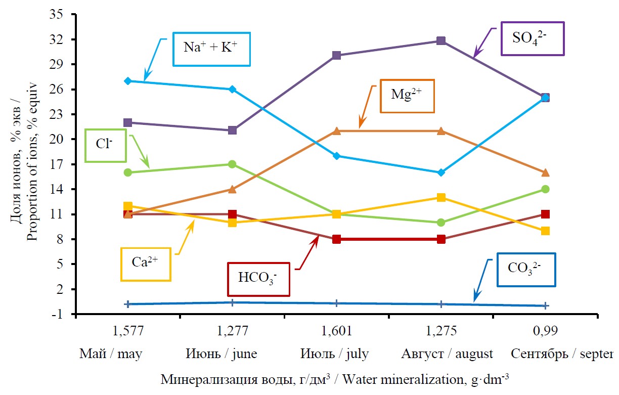 One of the important indicators of water quality is its mineral composition, in particular ions of the 1st group (CO32–, HCO3–, Cl–, SO42–, Ca2+, Mg2+, Na+, K+), which determine its water-salt balance and mineralization. Seasonal concentration of these ions is subject to change and the indicators of component composition of water vary greatly depending on geological and climatic conditions, which creates problems for interested water users [5].