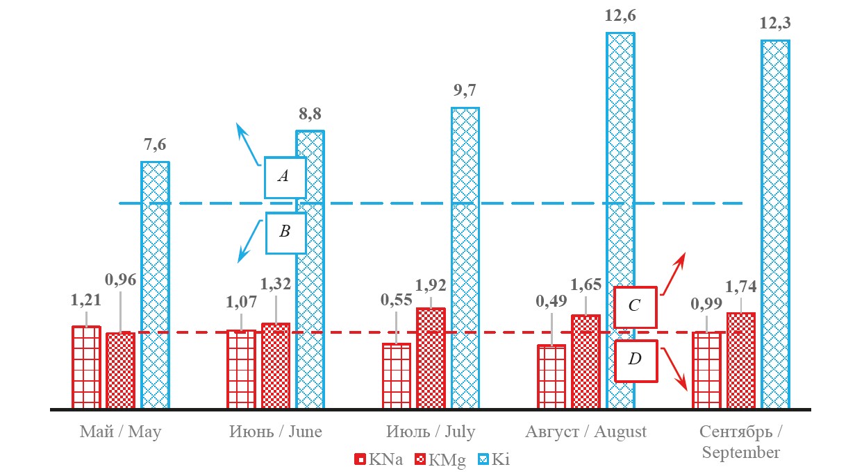 The calculations of irrigation coefficients (Fig. 2) considering variability of chemical composition of water over time (Table 4) also indicate its possible negative impact on ionic balance in soil absorption complex and meliorative state of soils as a whole [13—15].